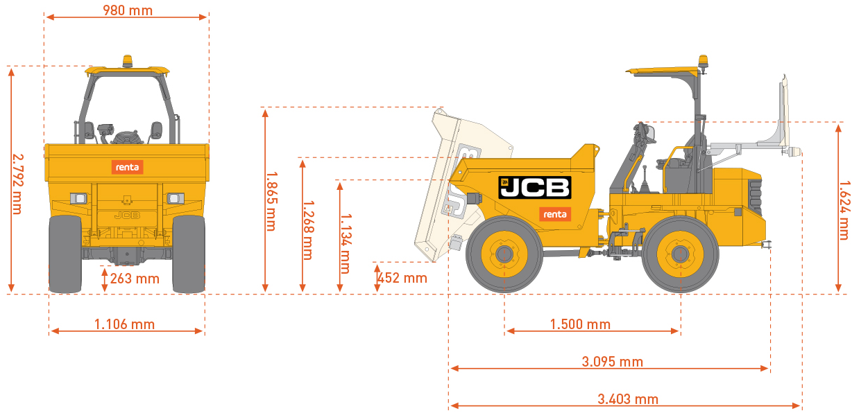 Lej JCB 1T-2 S5 højtip dumper hos Renta og få en stærk partner til materialetransport – uanset om du skal køre grus, jord eller nedrivningsaffald. Kontakt din nærmeste Renta-afdeling for booking og mere information.