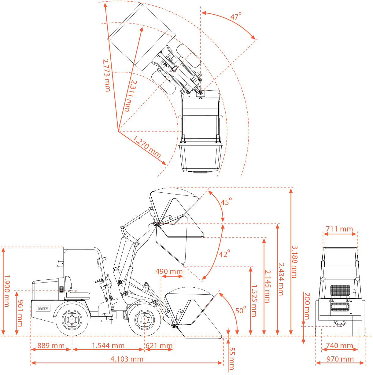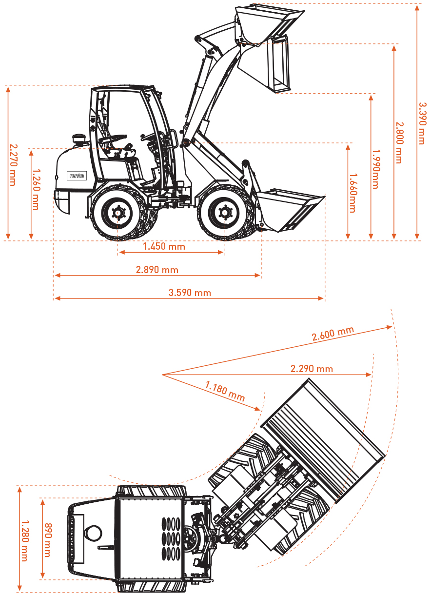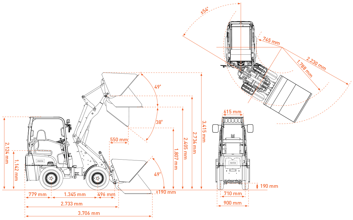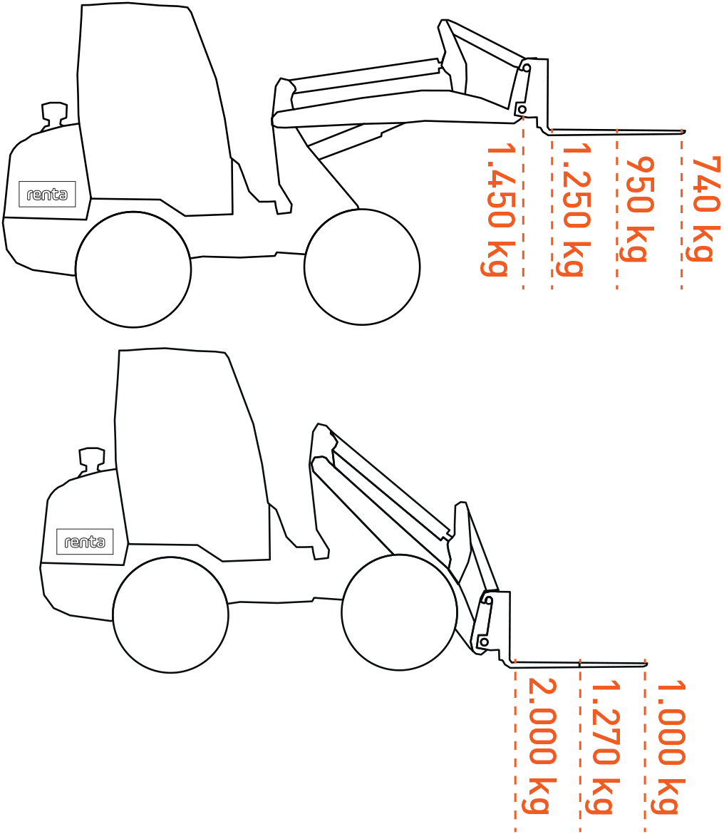 Maskinen klarer en tiplast på 799 kg og kan nå en løftehøjde på 2.558 mm, hvilket gør den ideel til læsning, flytning af materialer og skovlomdrejningspunkter. Den kompakte venderadius på 2.257 mm og hældningsvinkler på 12° op / 21° ned og 4° / 7° sideværts sikrer optimal stabilitet og smidig håndtering, selv på ujævnt underlag.