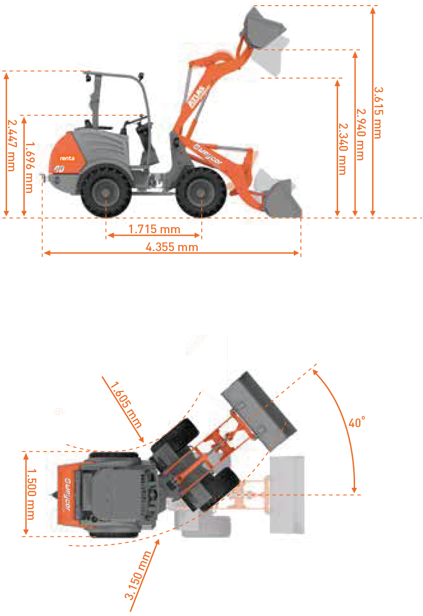Takket være den kompakte venderadius på kun 3.150 mm og det afbalancerede chassis er AR40 yderst manøvredygtig, også på snævre pladser og inde i byggeskel. Maskinen er desuden udstyret med hydraulisk hurtigskifte, så du nemt kan skifte mellem redskaber som skovl, gafler eller fejekost.