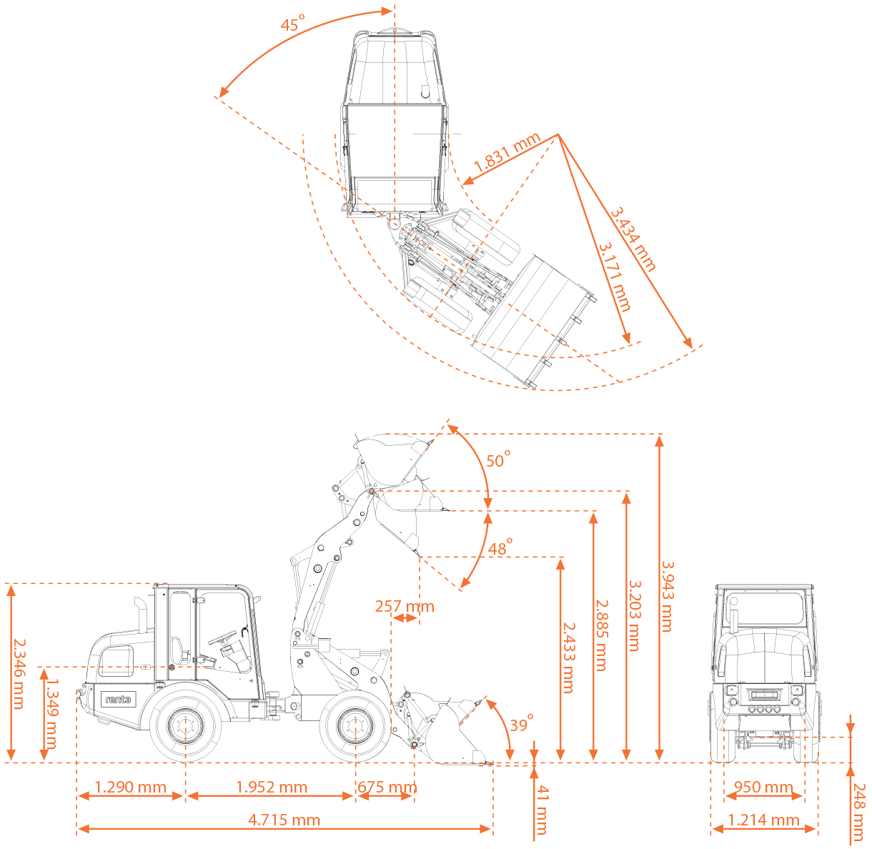 Maskinen har en løftehøjde på 3.203 mm, hvilket gør den ideel til skovlomdrejningspunkter og tunge løft, samtidig med at den kompakte venderadius på 3.171 mm sikrer smidig manøvrering på selv trange områder. Med en styrevinkel på maks. 45° og hældningsvinkler på 20° op/ned arbejder maskinen stabilt på ujævnt terræn, hvilket giver både sikkerhed og effektivitet.