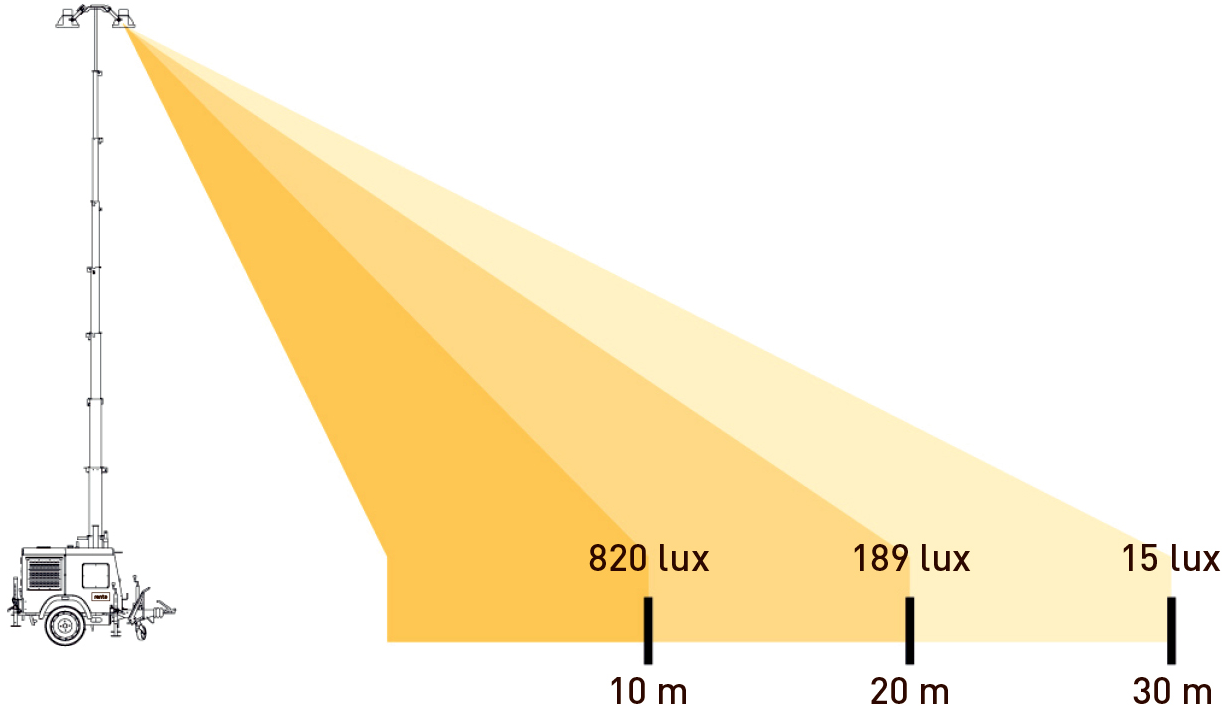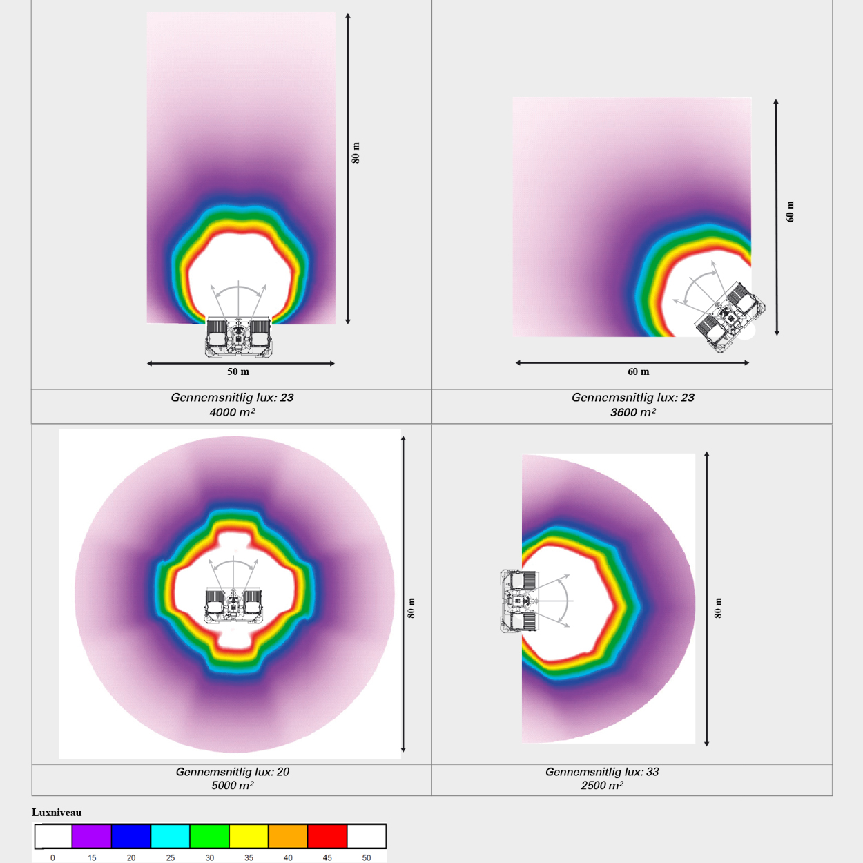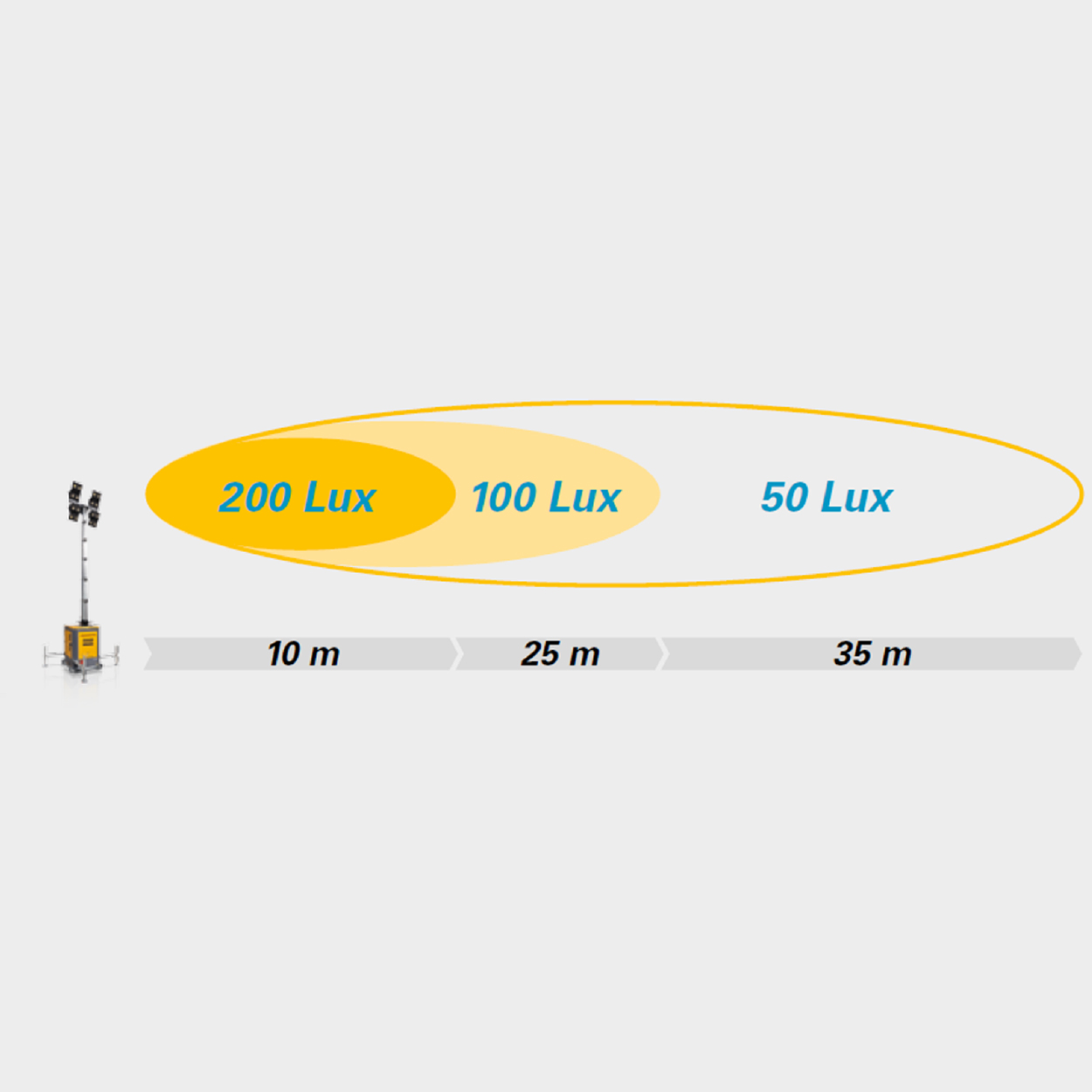 Masten er udstyret med 4 x 1.000 W halogenlygter, der tilsammen leverer hele 400.000 lumen, og oplyser op til 33.000 m². Det gør den særligt velegnet til meget store arbejdsområder og anlægsprojekter, hvor der er behov for kraftig og jævn belysning.