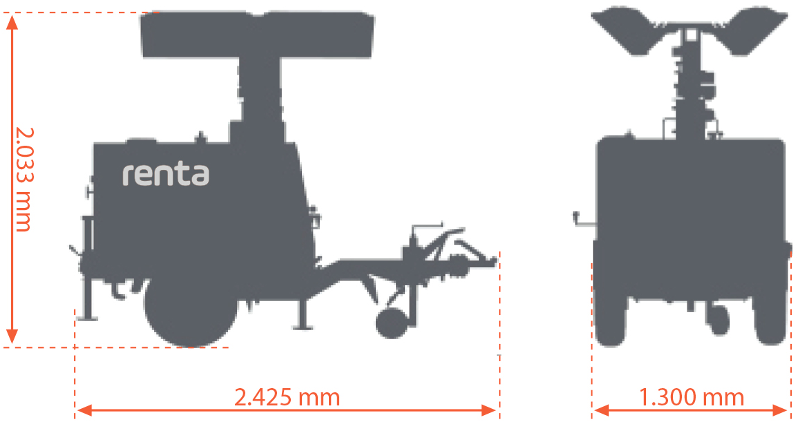 Med et lydtryk på kun 65 dB(A) er Himoinsa Apolo Compact Standard også velegnet til brug i støjfølsomme områder – f.eks. tæt på beboelse eller ved aftenarbejde. Masten har en egenvægt på 911 kg og kompakte transportmål (2.033 x 1.300 x 2.425 mm), hvilket gør den nem at transportere og opstille.