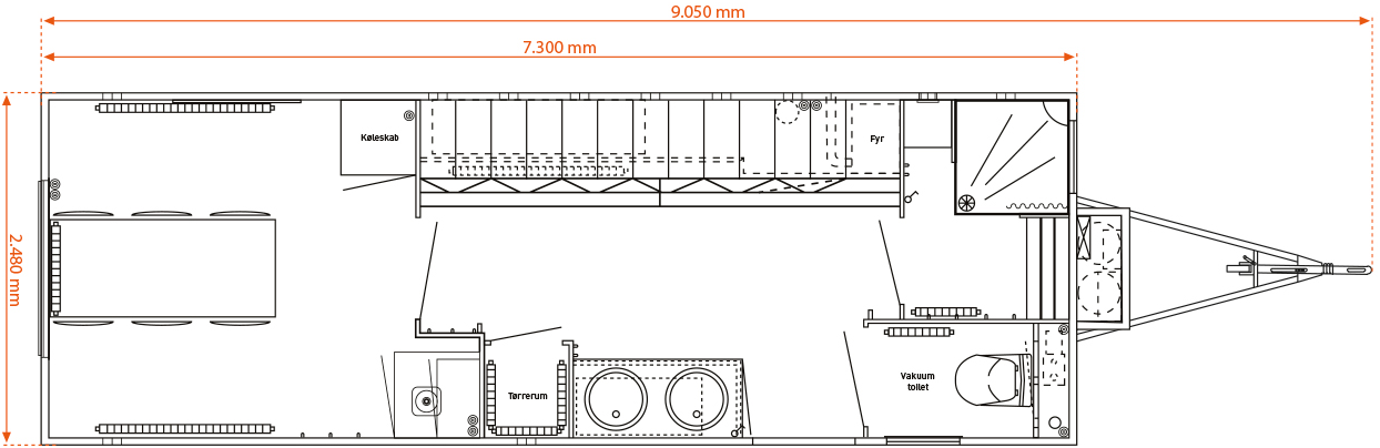 Pionérvognen indeholder alt det, du skal bruge for at holde komforten på plads: vakuumtoilet, brusekabine, håndvask, køleskab på gas, rustfrit gasblus, tørreskab, teknikskab og centralvarme (gas/el). Der er desuden bord, seks stole, fast trappe og opslagstavle, så hele sjakket har ordentlige forhold i pauserne.