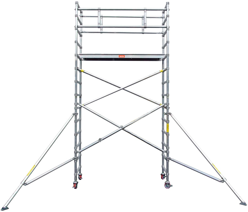 Stilladset er kun 0,74 meter bredt, hvilket gør det perfekt til steder med begrænset plads, f.eks. gange, indgangspartier eller indendørs installationer. På trods af den smalle konstruktion står det stabilt og sikkert, takket være det robuste aluminiumsstel og kraftige hjul med bremser.