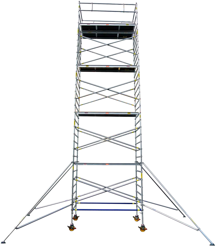 Stilladset er fremstillet i let, men robust aluminium, hvilket gør det både stærkt og nemt at håndtere. Det kan hurtigt samles uden brug af specialværktøj, og de store hjul med bremser sikrer, at du kan flytte stilladset mellem arbejdsområder med minimal indsats. Når det er på plads, står det stabilt og sikkert – også i fuld højde.