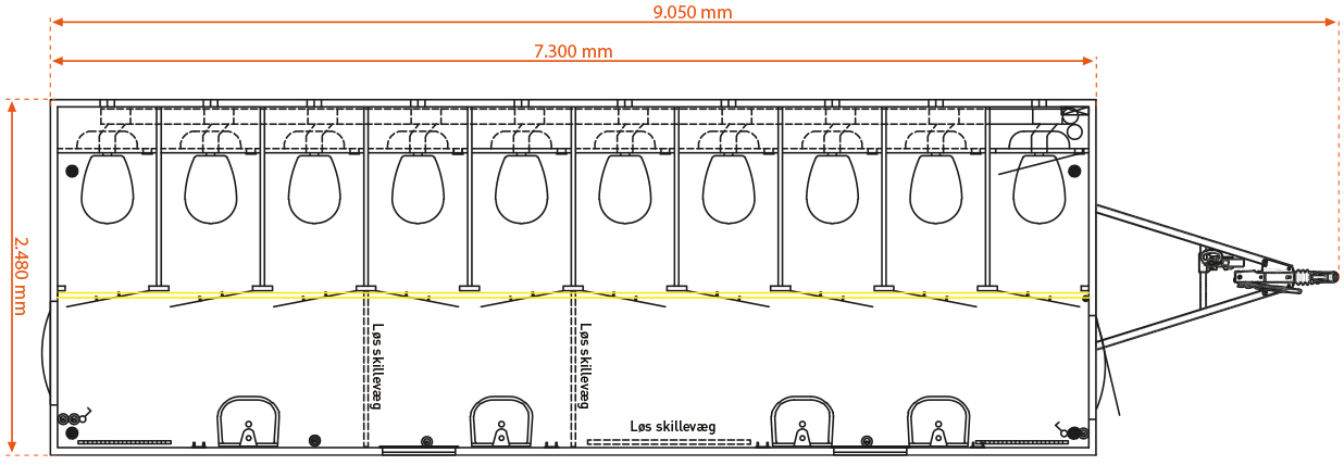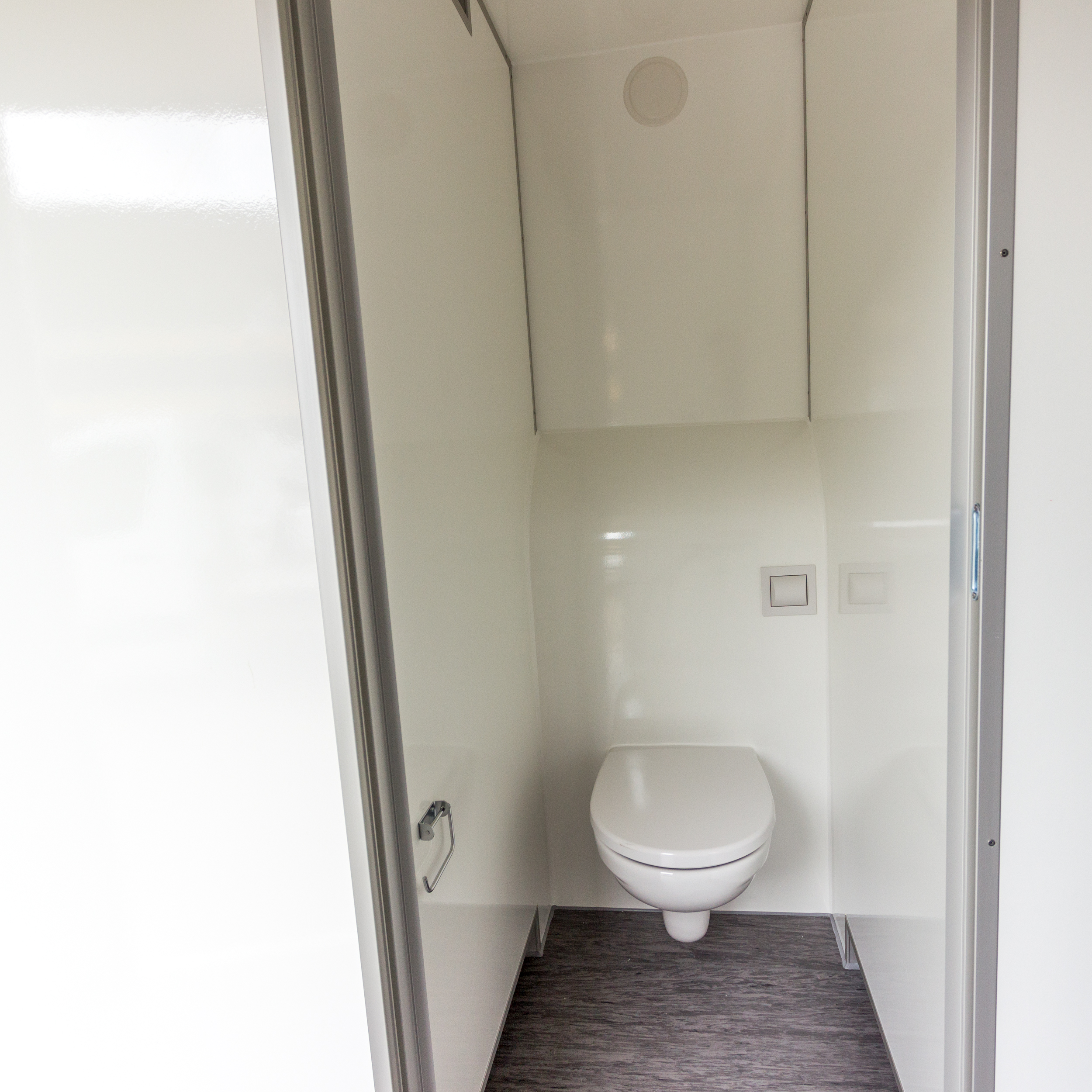 Vognen indeholder 10 separate vandskyllende toiletter, alle med let tilgængelige serviceluger på ydersiden for hurtig tømning og vedligeholdelse. Indgangen er placeret midt på vognen, hvor der er opdelt i to sektioner – én til damer og én til herrer. Den fleksible, flytbare skillevæg gør det desuden muligt at tilpasse opdelingen, så du kan vælge mellem 5/5 eller 10 samlede toiletter, alt efter behov.